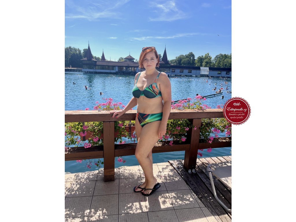 Dvoudílné plavky, košíčky s kosticemi, klasický střih kalhotek. Košíčky nemají žádnou výztuž, která do sebe natáhne během plavání velké množství vody, přesto díky materiálu perfektné drží poprsí, a to i ve větších velikostech.