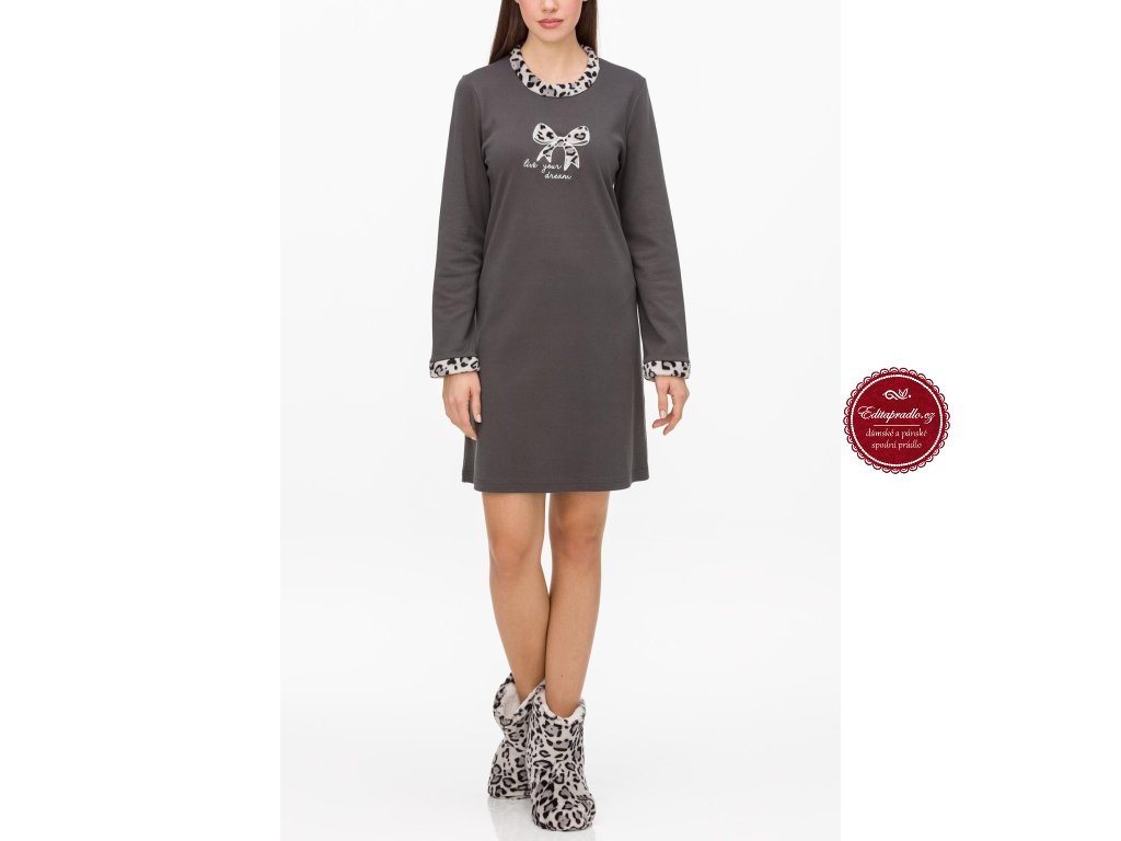 Výborně vypadá a díky bavlně se skvěle nosí! Dámská noční košile v šedém odstínu s mašličkou a zdobenými rukávy. Košilka je vyrobena z vysoce kvalitní bavlny, která Vám zajistí příjemný pocit a komfort během spánku.