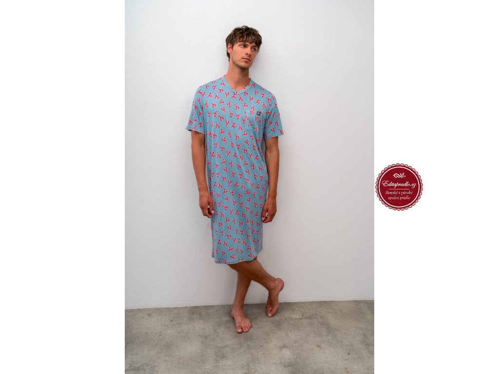 Pohodlná pánská noční košile s potiskem raka. Pánská noční košile má náprsní kapsičkou a výstřihem do V.